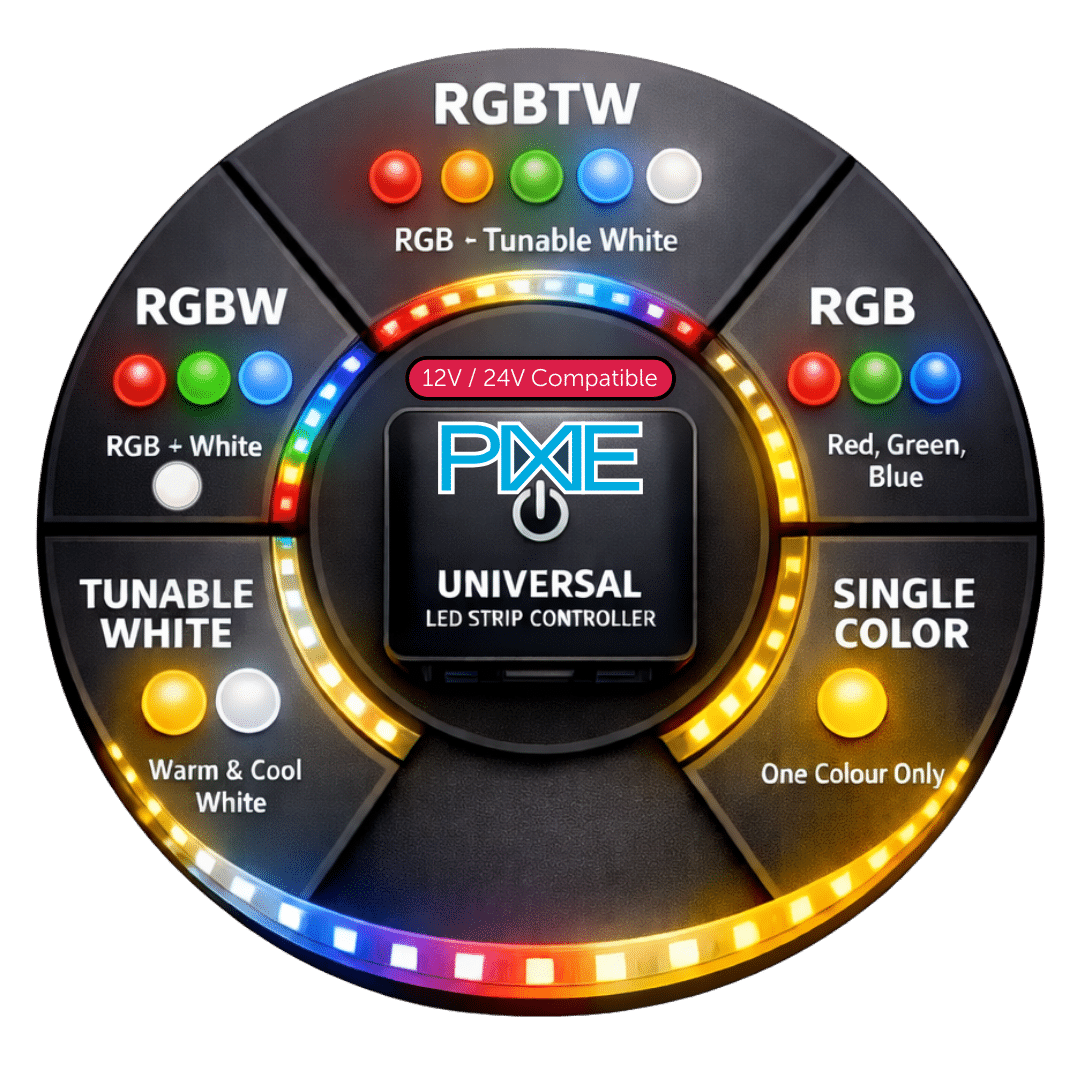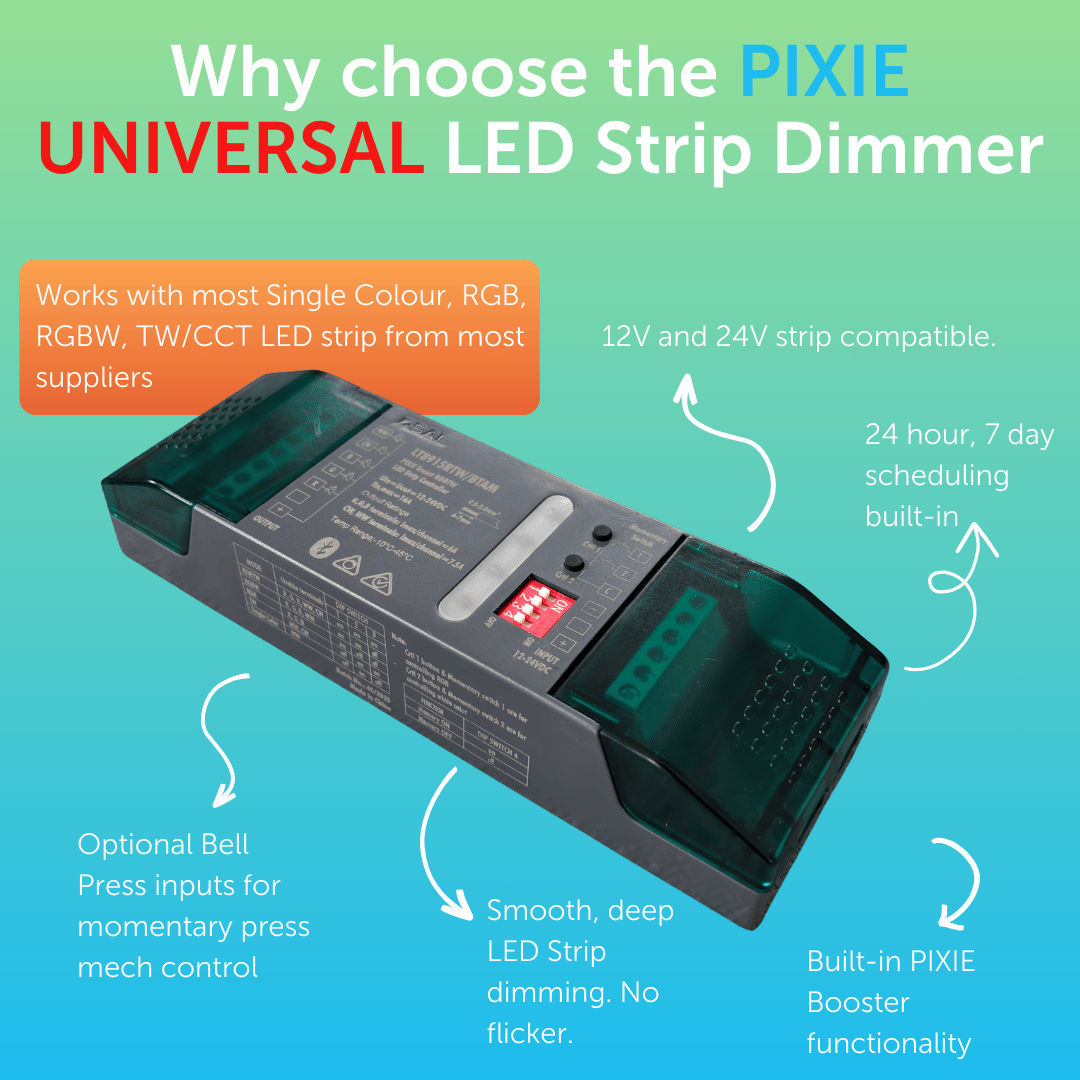 This universal LED strip controller from PIXIE is the only LED strip dimmer you will need for PIXIE and NON PIXIE projects, to guarantee smooth dimming performance (intensity), and where capable, colour tuning in the spectrum of the LED strip connected.